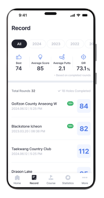 View accumulated round records by year, including scores / averages / trends, at a glance.
