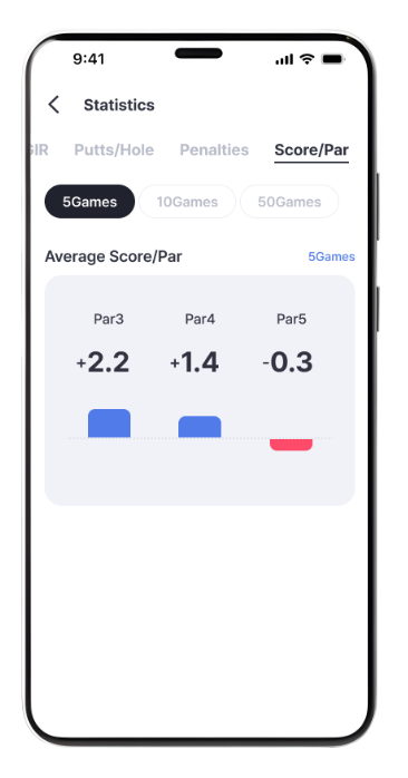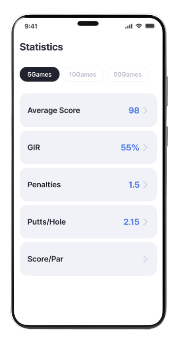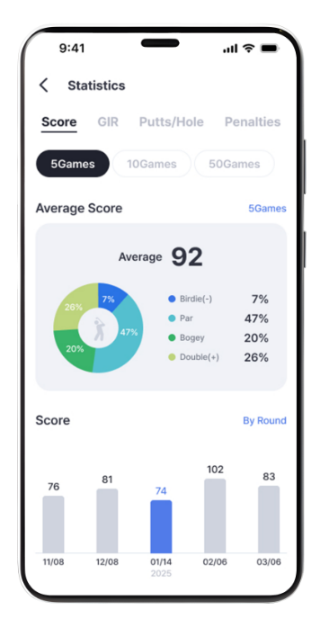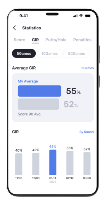 Visually check key metrics based on recent rounds (score / GIR / putts, etc.).